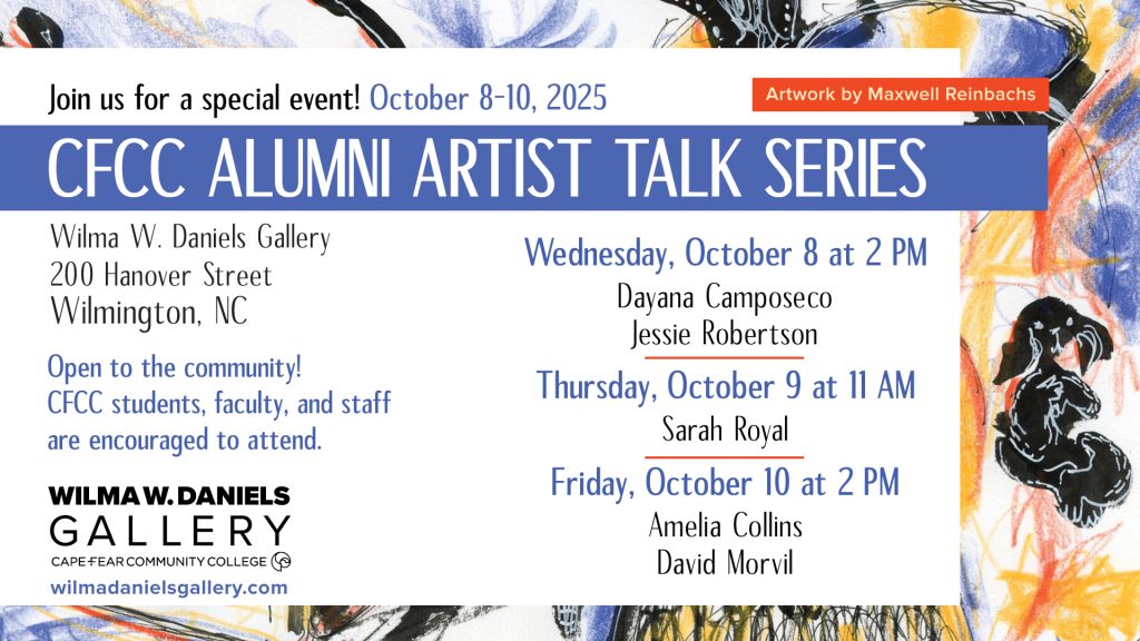 Join us in the gallery for a special event! On October 8th, 9th, and 10th, five selected artists from our 2025 CFCC Alumni Art Exhibition will be in the gallery to speak on their process, practice, and path after graduating from our programs.