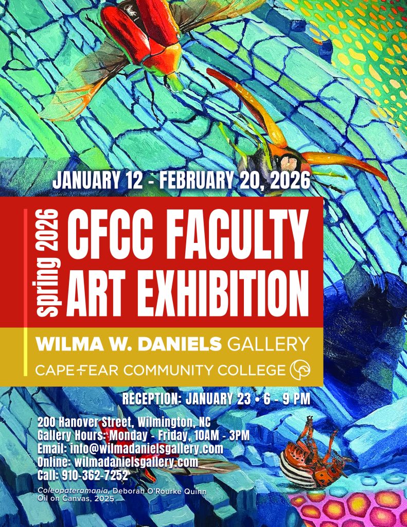 Wilma W. Daniels Gallery and Cape Fear Community College are proud to present the 2026 CFCC Faculty Art Exhibition, showcasing the talents of the faculty within our Commercial, Fine and Performing Arts Department. This annual exhibition celebrates the creative vision, technical mastery, and artistic leadership that define CFCC’s arts programs.