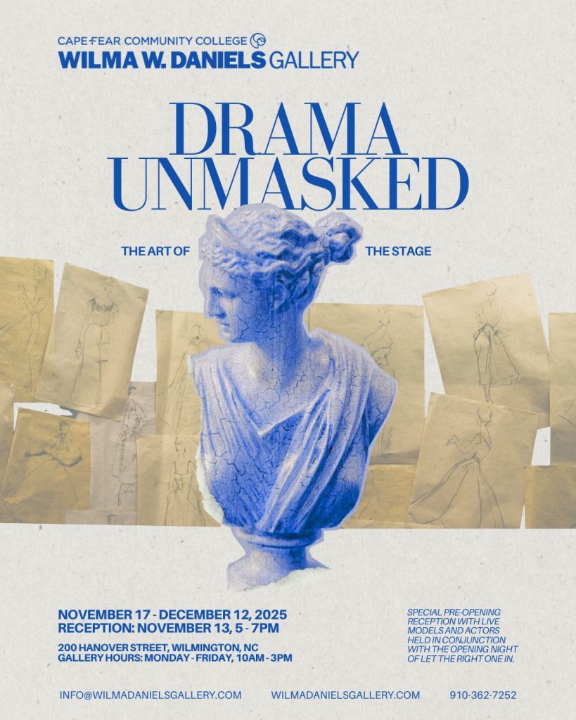 Wilma W. Daniels Gallery and Cape Fear Community College are proud to present Drama Unmasked: The Art of the Stage. This exhibition illuminates the intricate artistry behind theatre production, offering a behind-the-scenes look at the creative forces that shape the stage. From set design and character development to costume creation and performance, Drama Unmasked reveals the collaborative magic that transforms scripts into theatrical universes.